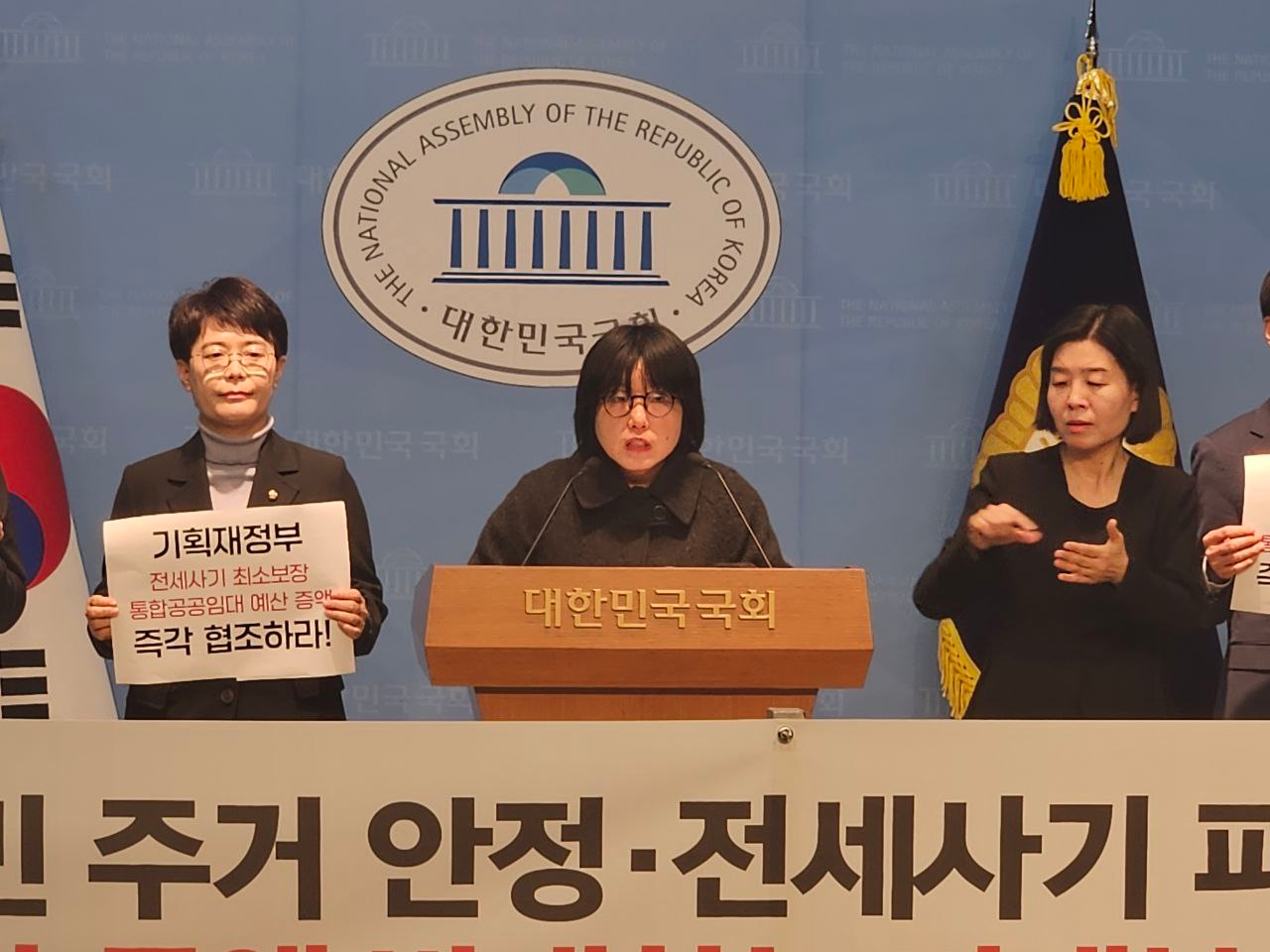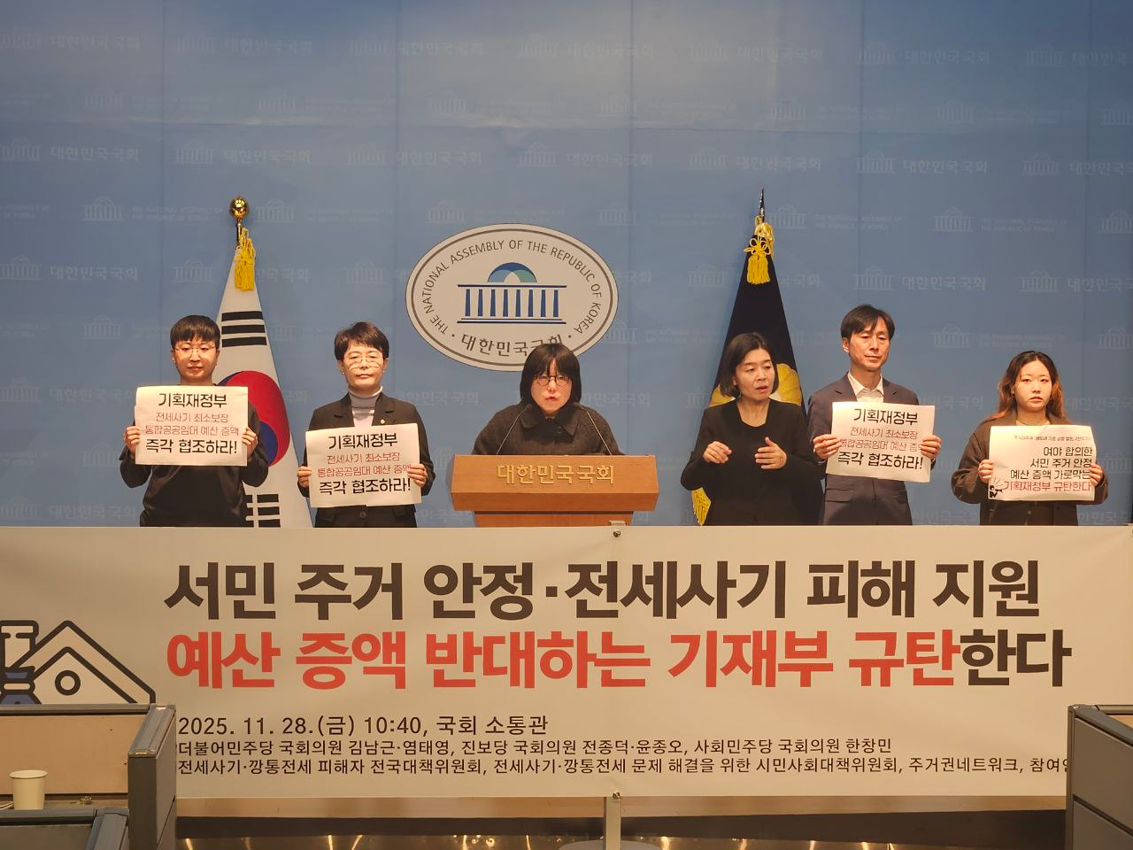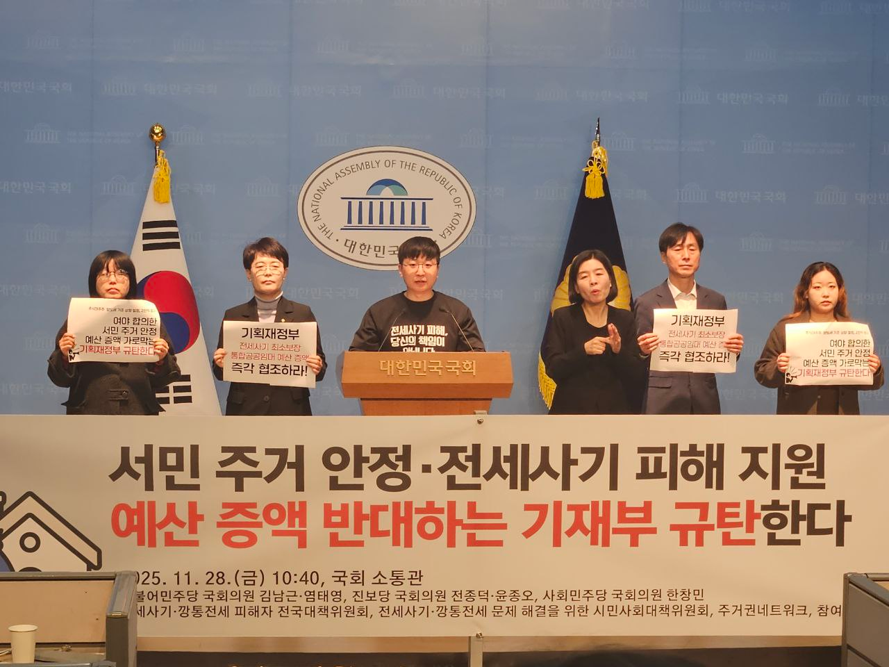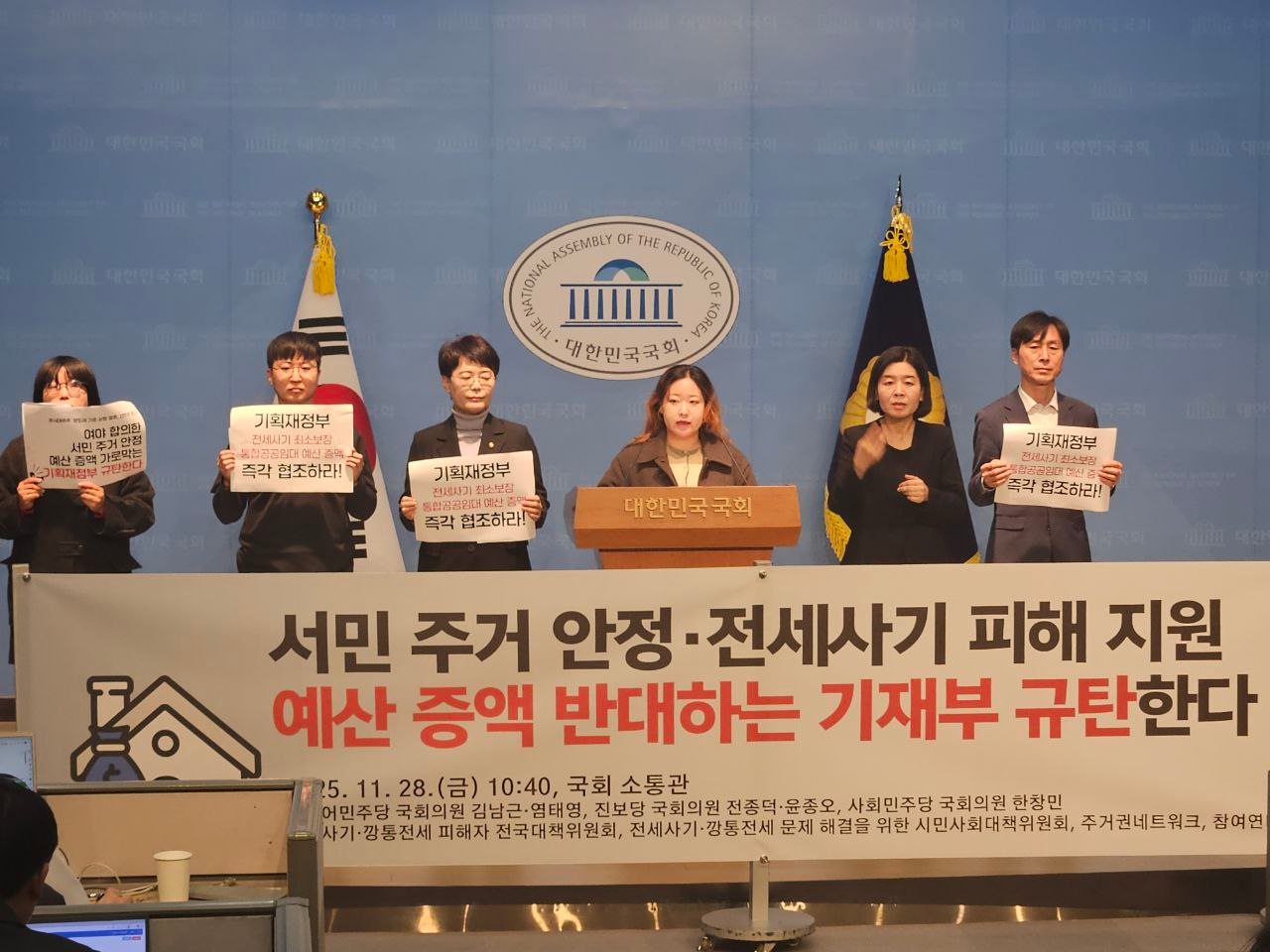 11월 28일(금) 오전 10시 40분 국회 소통관에서 여야 국회의원, 전세사기 피해자, 주거시민단체들은 기재획재정부의 무책임한 예산 증액 반대를 규탄하는 기자회견을 열었습니다. 전세사기와 주거 불안이 계속 되는 상황 속에서 기재부는 전세사기 피해자 최소지원금 예산 1,000억 원, 통합공공임대주택 예산 2,273억 원(융자 1,151억 원, 출자 1,122억 원)에 대한 예산 증액을 반대하였습니다. 기재부는 전세사기 피해 지원과 공공임대주택 예산 증액에 대해 적극 협조해야 합니다.