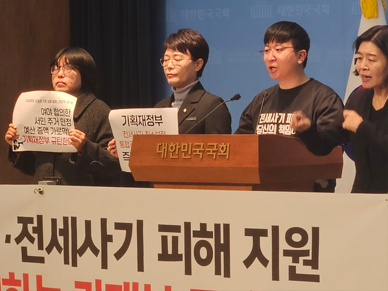 전세사기 피해자들은 타는 목마름으로 이번 개정을 기다리고 있습니다. 기재부는 권리를 보장하는 한시가 시급한 사안에 더 이상 어깃장 놓지 마시고 정부의 책임을 다할 것을 다시 한 번 촉구합니다.