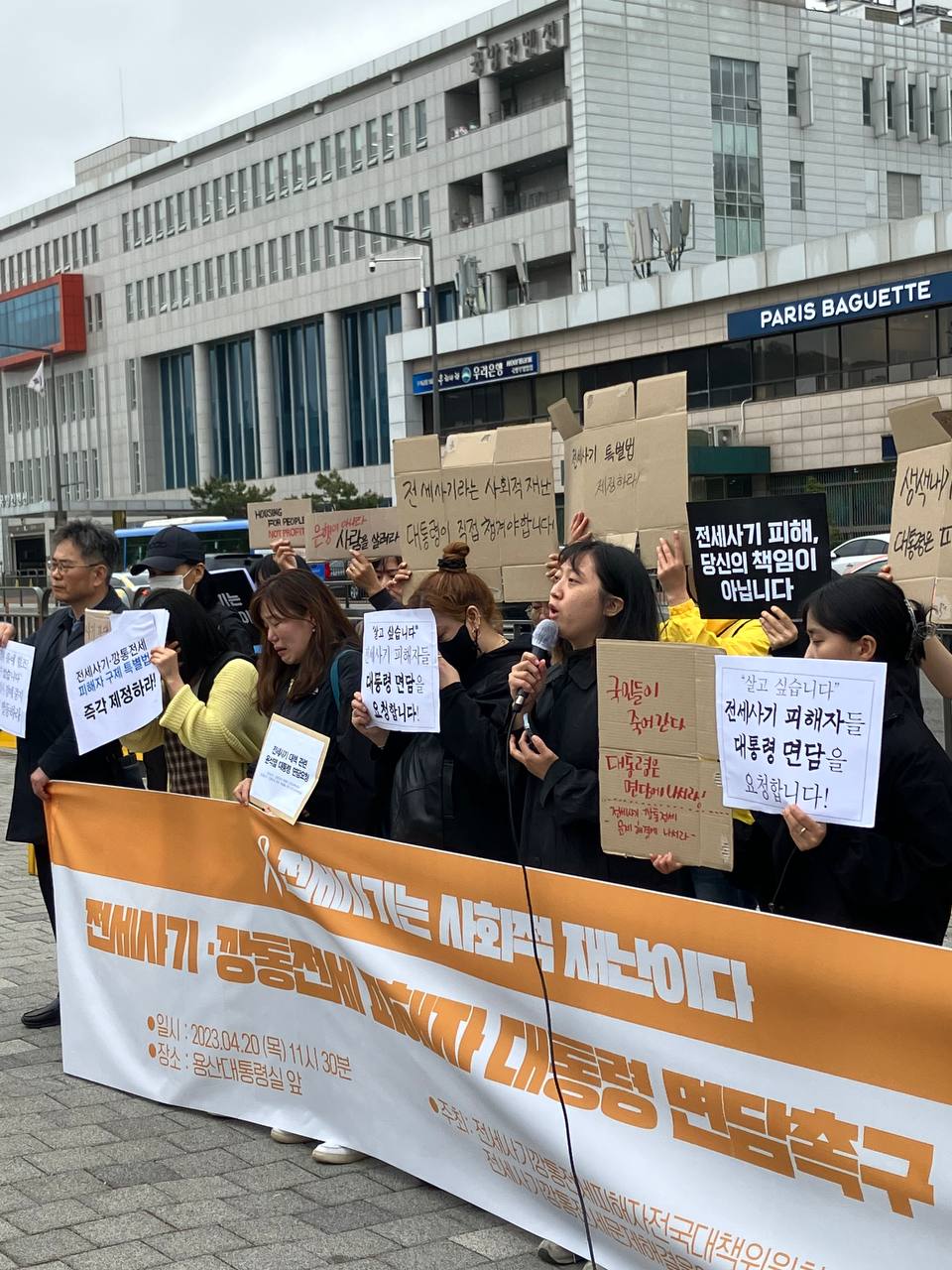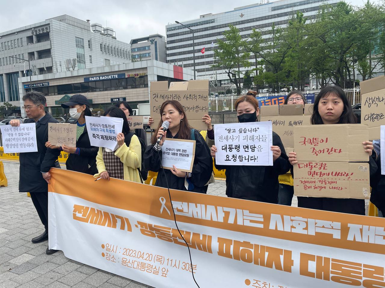 1. 미추홀구전세사기피해대책위, 빌라왕 김00피해대책위, 전국에 개별적으로 흩어져 활동하던 피해자들이 모인 ‘전세사기·깡통전세 피해자 전국대책위원회’와 65개 종교·노동·시민사회단체들이 함께 하는 ‘전세사기·깡통전세 문제 해결을 위한 시민사회대책위원회’는 오늘(4/20) 용산 대통령실 앞에서 기자회견을 열어 전세사기 대책과 관련하여 윤석열 대통령 면담을 요청했습니다.