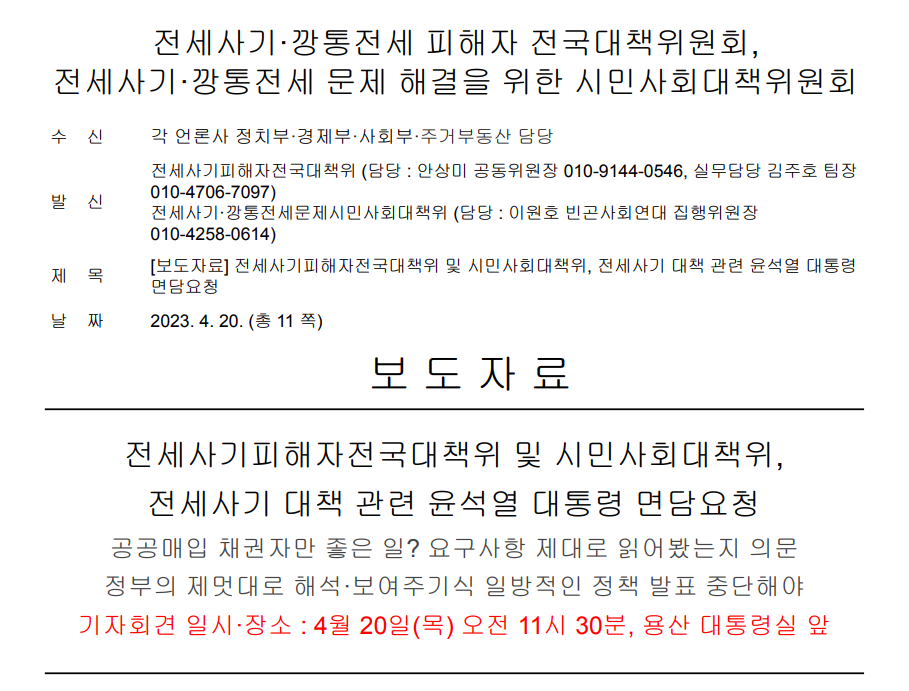 [보도자료] 전세사기피해자전국대책위 및 시민사회대책위, 전세사기 대책 관련 윤석열 대통령 면담요청
