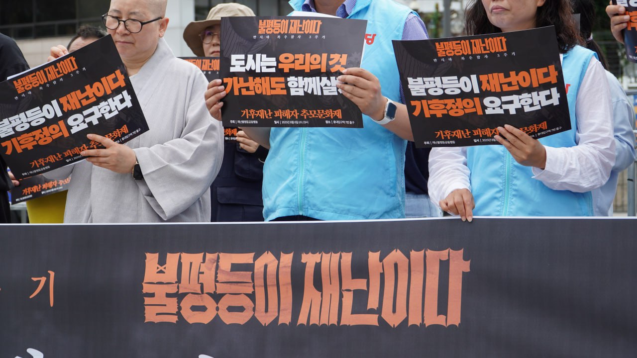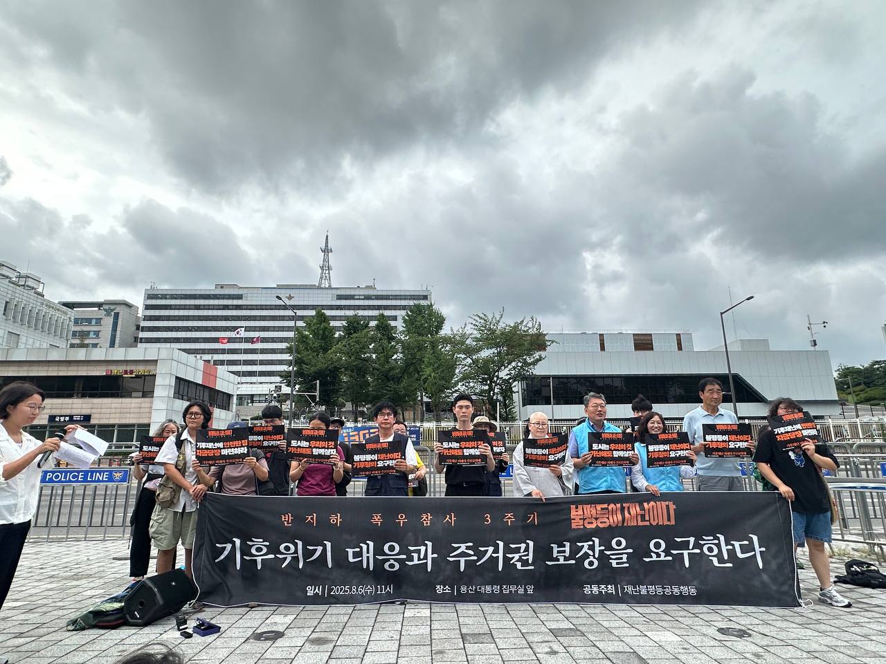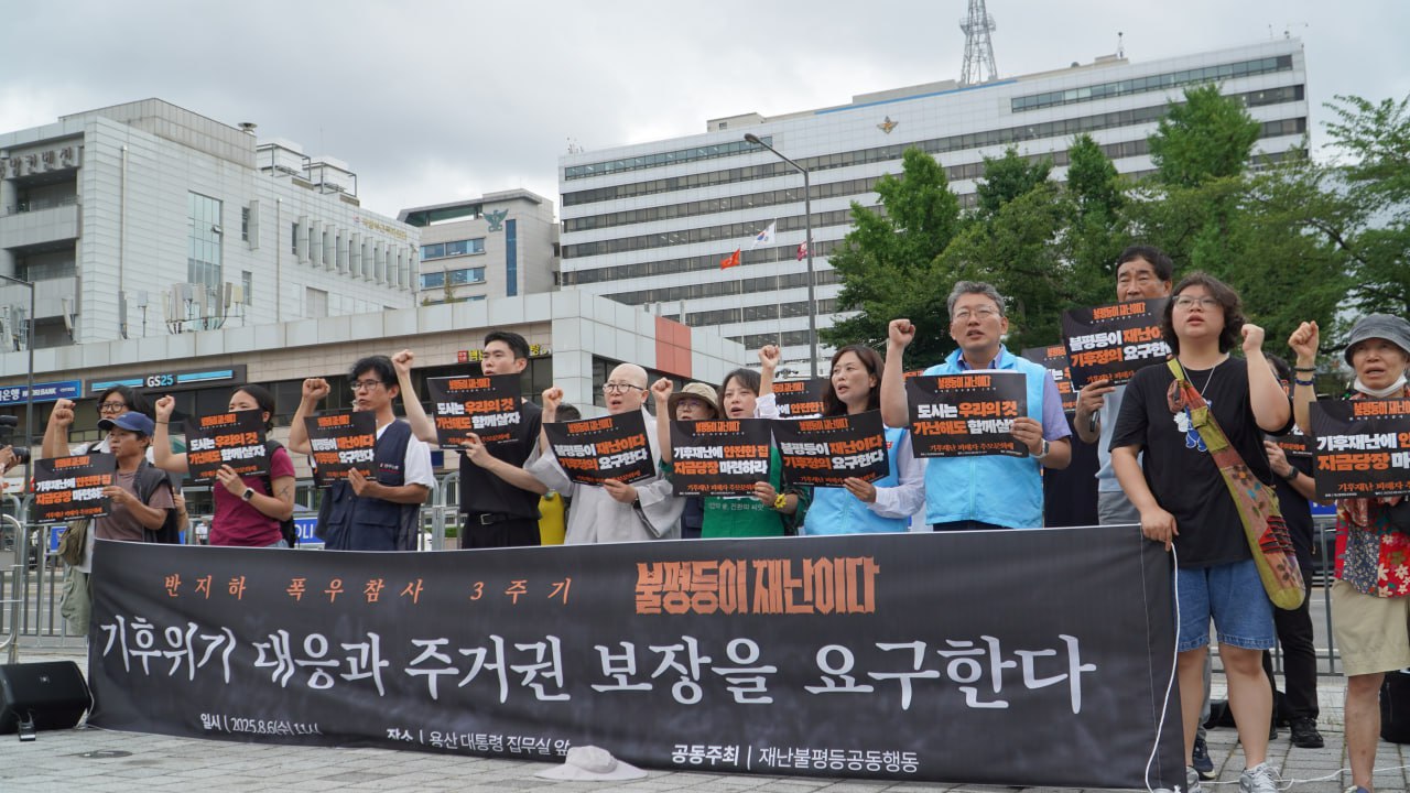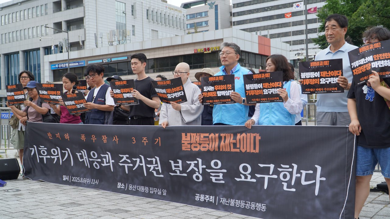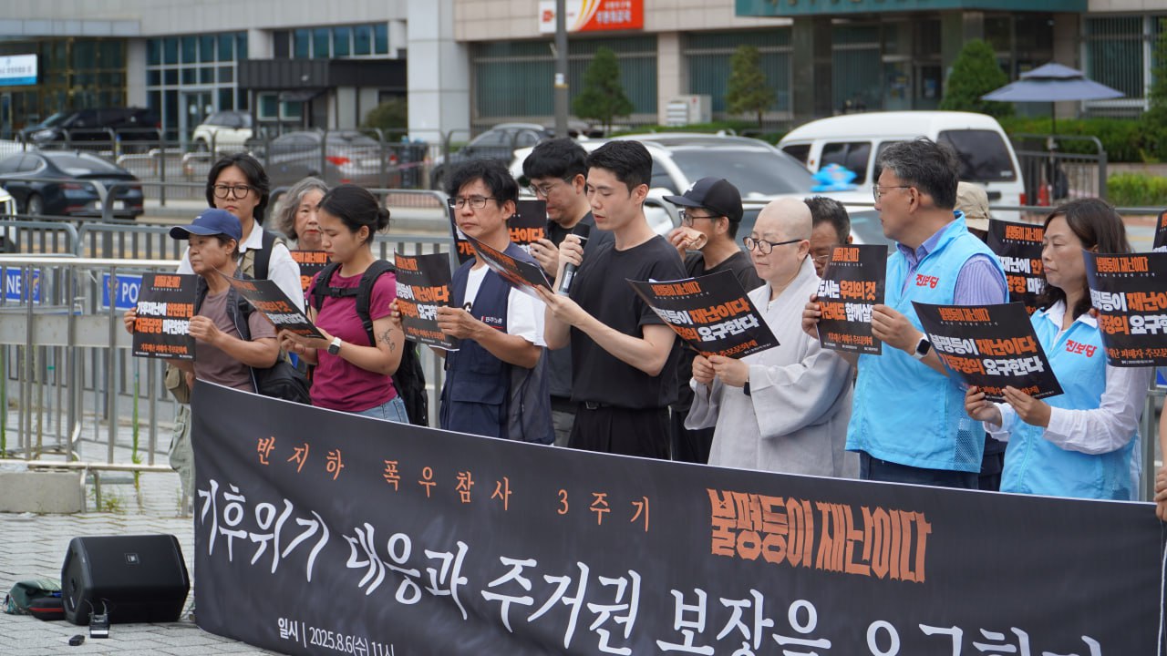 8월 6일 오전 11시, 용산 대통령 집무실 앞에서 반지하 폭우 참사 3주기 맞아, 기후재난 희생자 추모와 새정부 기후위기 대응 및 주거권 보장 정책 요구 기자회견을 했습니다. 3년 전 반지하 폭우 참사의 희생자를 추모하며 "불평등이 재난이다"를 외쳤지만, 아직도 기후재난과 주거 불평등은 여전합니다. 새로운 정부가 출범한 이 시점에서 반지하 폭우 참사 3주기를 맞아 불평등 해결을 위한 사회공공성을 강화하고, 기후위기 대응과 기후 정의에 기반한 주거권 보장에 나설 것을 요구했습니다.