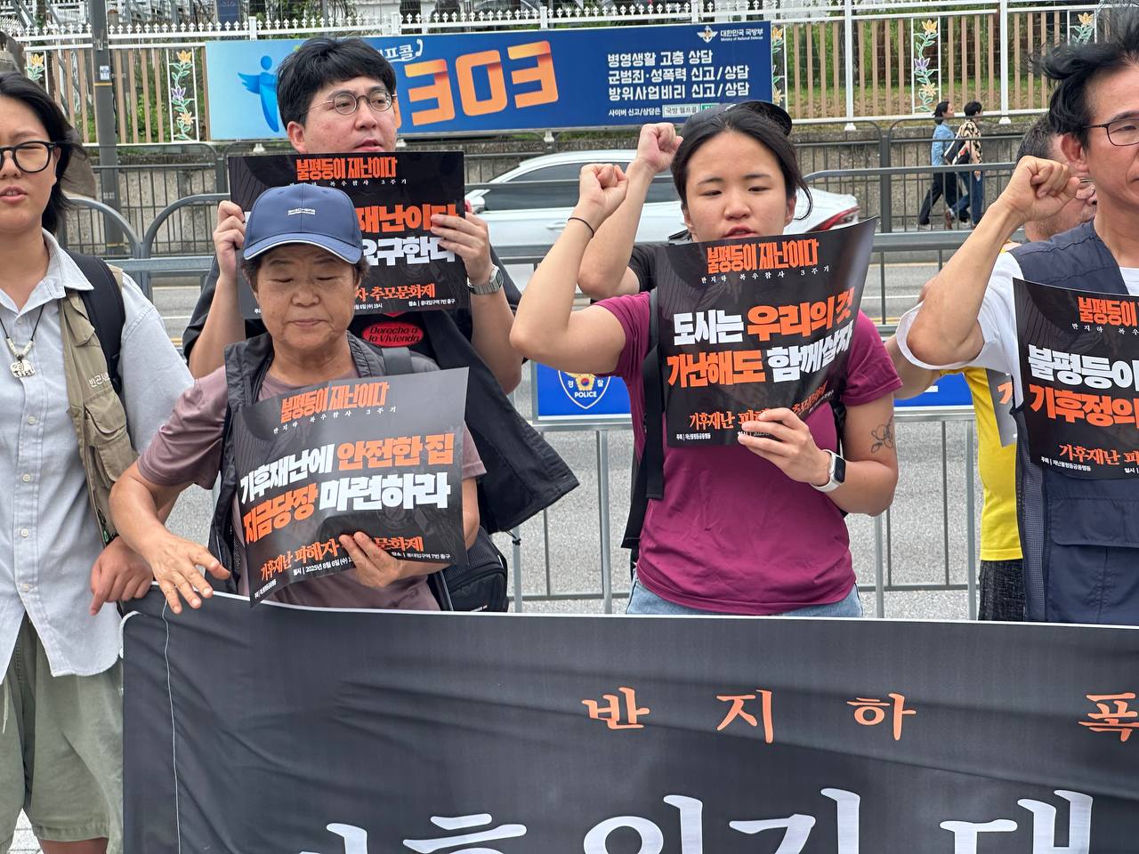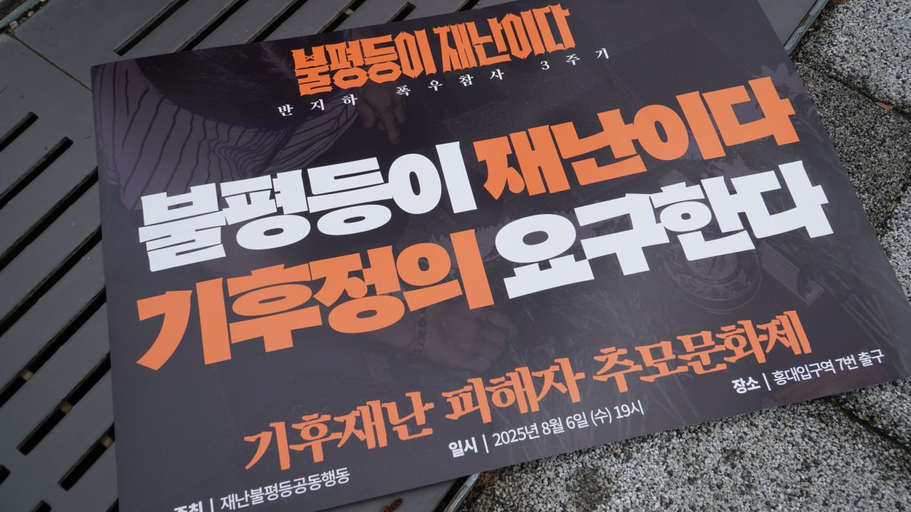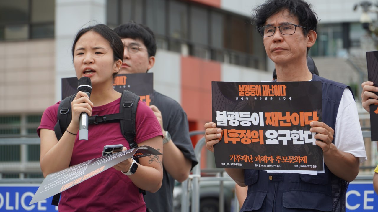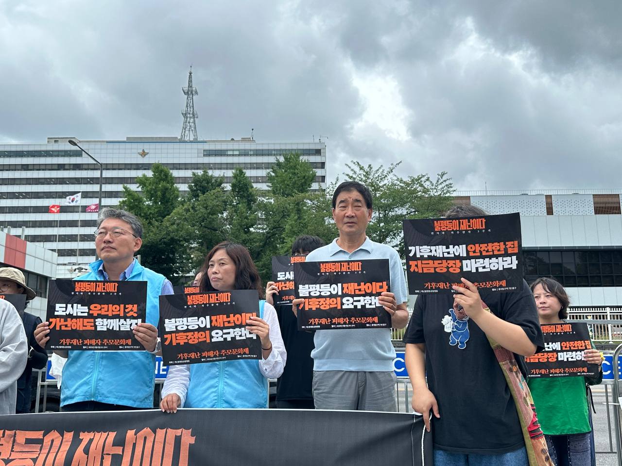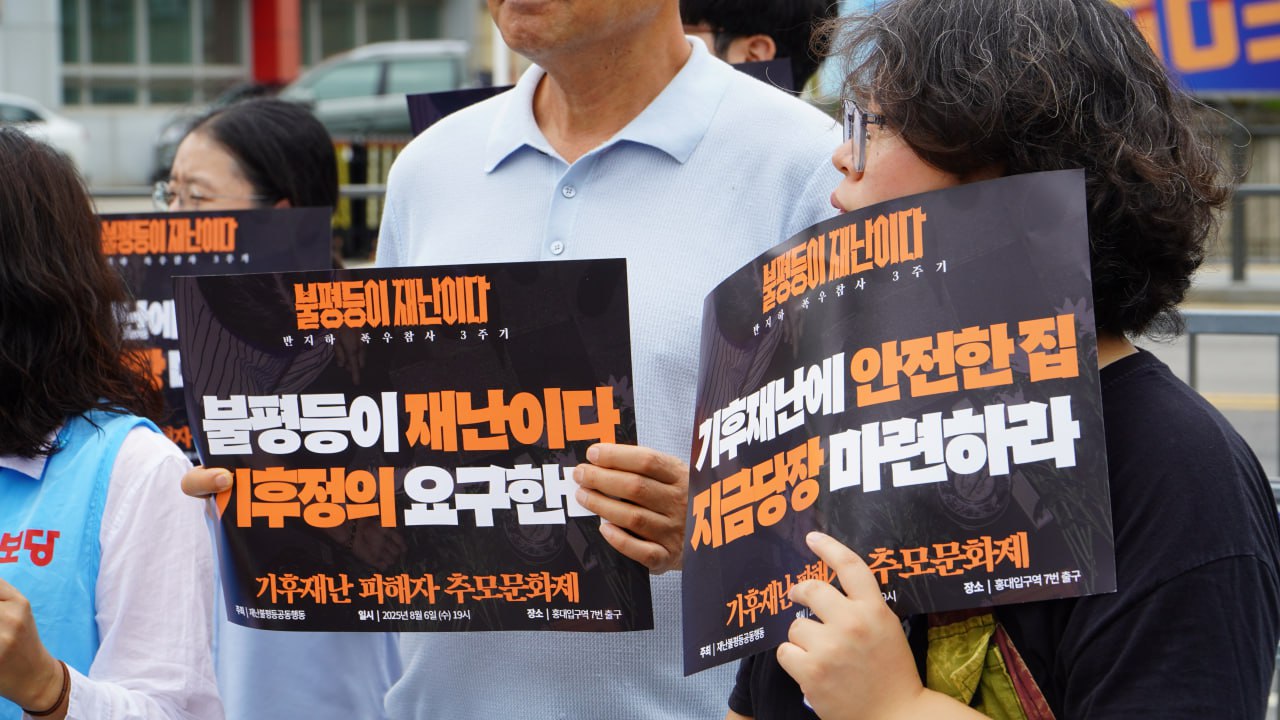 8월 6일 오전 11시, 용산 대통령 집무실 앞에서 반지하 폭우 참사 3주기 맞아, 기후재난 희생자 추모와 새정부 기후위기 대응 및 주거권 보장 정책 요구 기자회견을 했습니다. 3년 전 반지하 폭우 참사의 희생자를 추모하며 "불평등이 재난이다"를 외쳤지만, 아직도 기후재난과 주거 불평등은 여전합니다. 새로운 정부가 출범한 이 시점에서 반지하 폭우 참사 3주기를 맞아 불평등 해결을 위한 사회공공성을 강화하고, 기후위기 대응과 기후 정의에 기반한 주거권 보장에 나설 것을 요구했습니다.