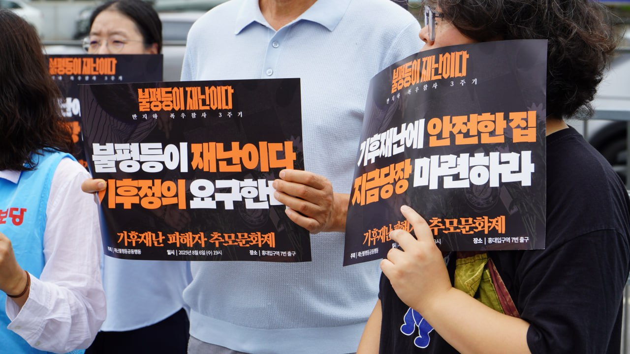 반지하주택에 어떤 대책이 있었는가를 돌아보면, 분노하지지 않을 수 없습니다. 지상주택으로의 이주율은 3퍼센트밖에 되지 못하고, 완료했다는 차수판 설치는 알고보니 신청한 건물만 해당되는 일이었습니다. 소유주들이 집값 떨어진다며 차수판 설치를 거부했다는 얘기, 서울시가 여기에 어쩔 수 없다는 입장이라는 얘기에, 어떻게 이 나라가 이 도시가 정의롭고 민주적인 곳이라고 할 수 있겠습니까. 기후재난을 심화시키는 불평등, 재난 그 자체인 불평등을 해결해야합니다.