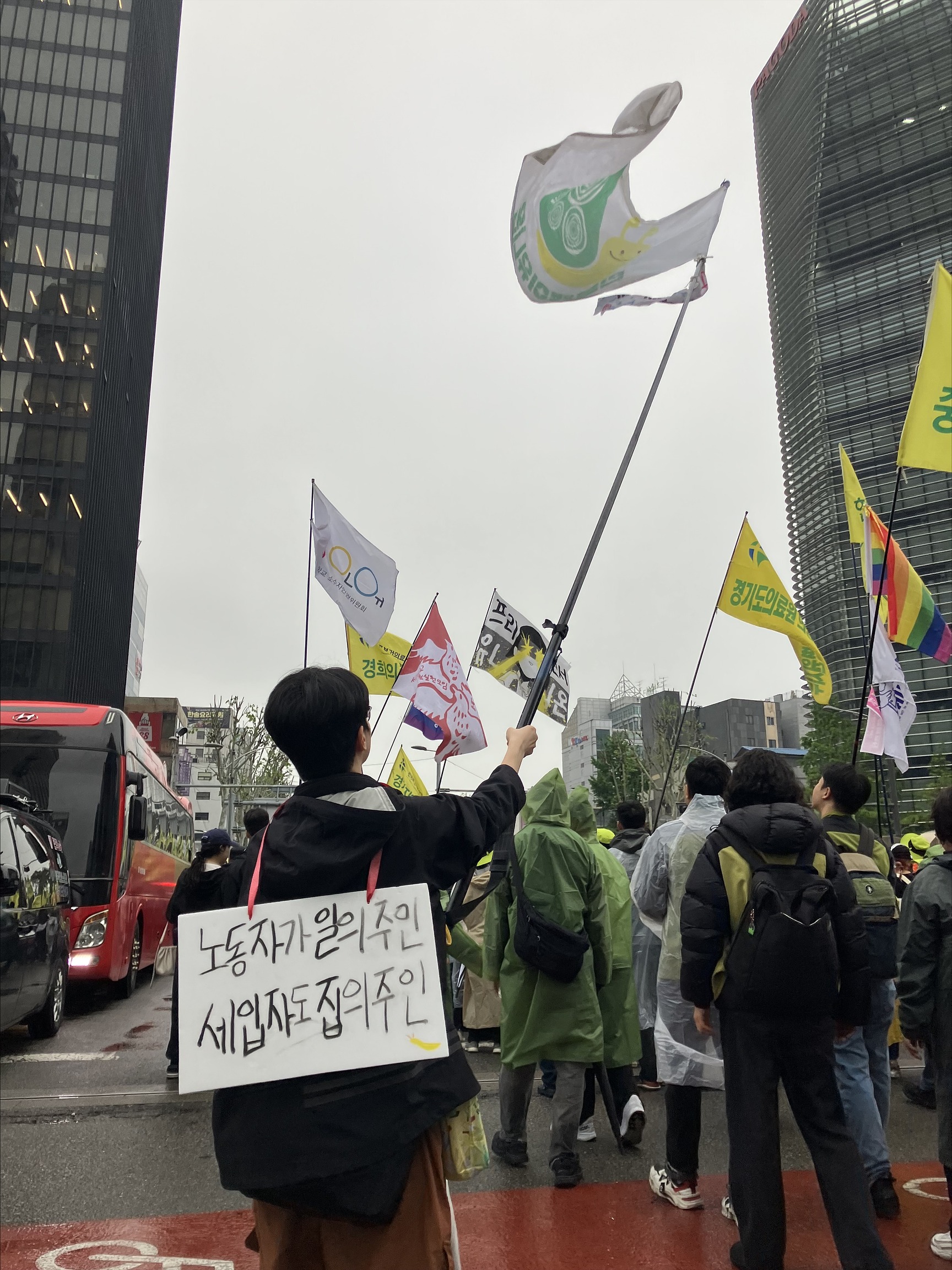 2025 세계노동절대회, 민달팽이유니온 회원이 ‘노동자가 일의 주인, 세입자도 집의 주인’이라 고 적힌 피켓과 함께 깃발을 들고 행진하고 있다.