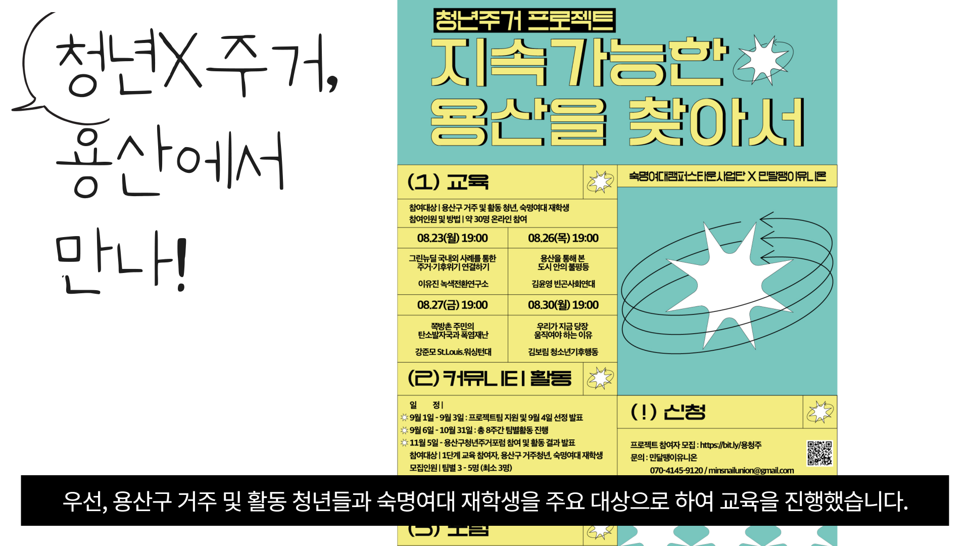 우선, 용산구 거주 및 활동 청년들과 숙명여대 재학생을 주요 대상으로 하여 교육을 진행했습니다.