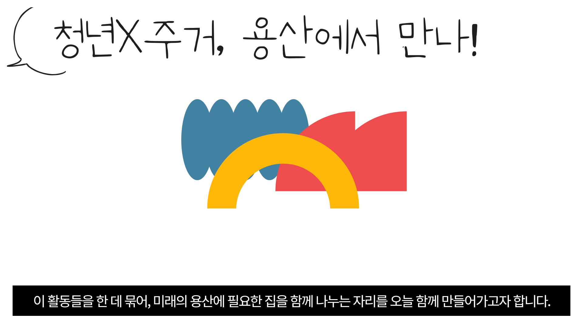 이 활동들을 한 데 묶어, 미래의 용산에 필요한 집을 함께 나누는 자리를 오늘 함께 만들어가고자 합니다.
