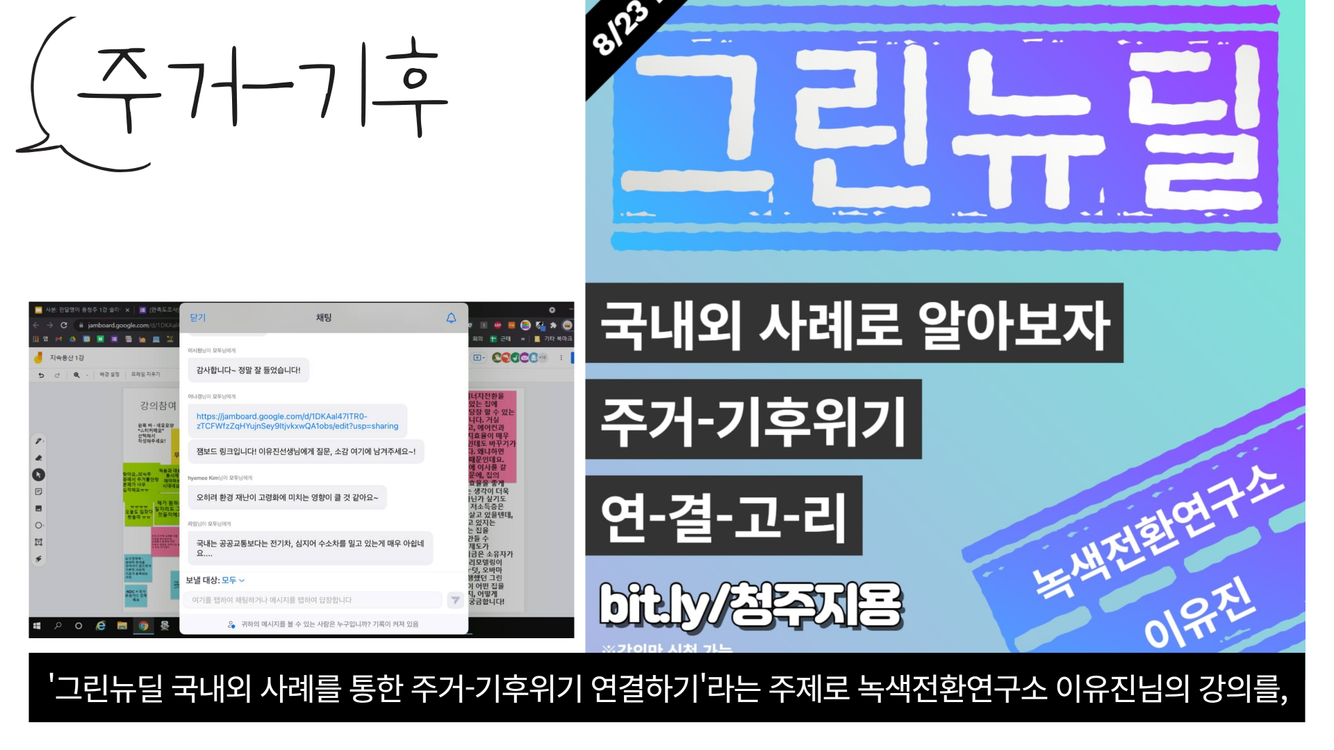 그린뉴딜 국내외 사례를 통한 주거-기후위기 연결하기, 라는 주제로 녹색전환연구소 이유진님의 강의를,