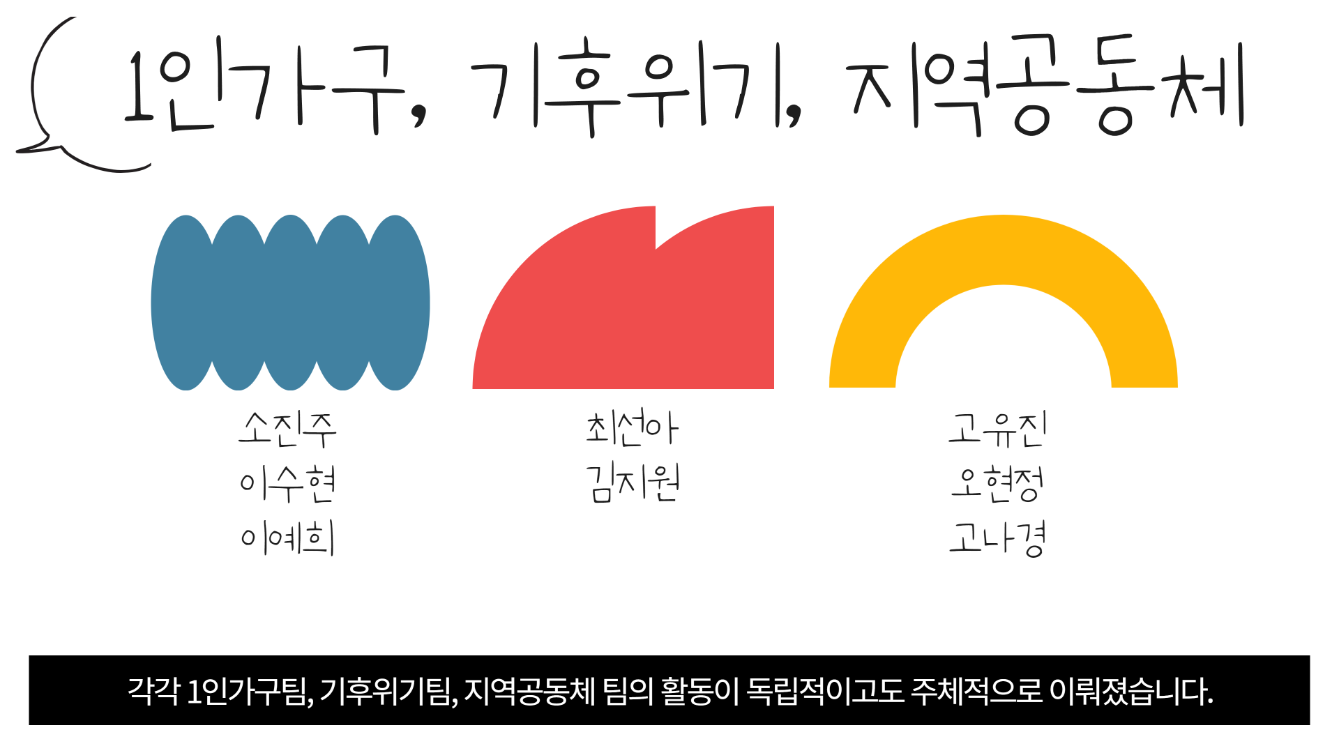 각각 1인가구팀, 기후위기팀, 지역공동체 팀의 활동이 독립적이고도 주체적으로 이뤄졌습니다.