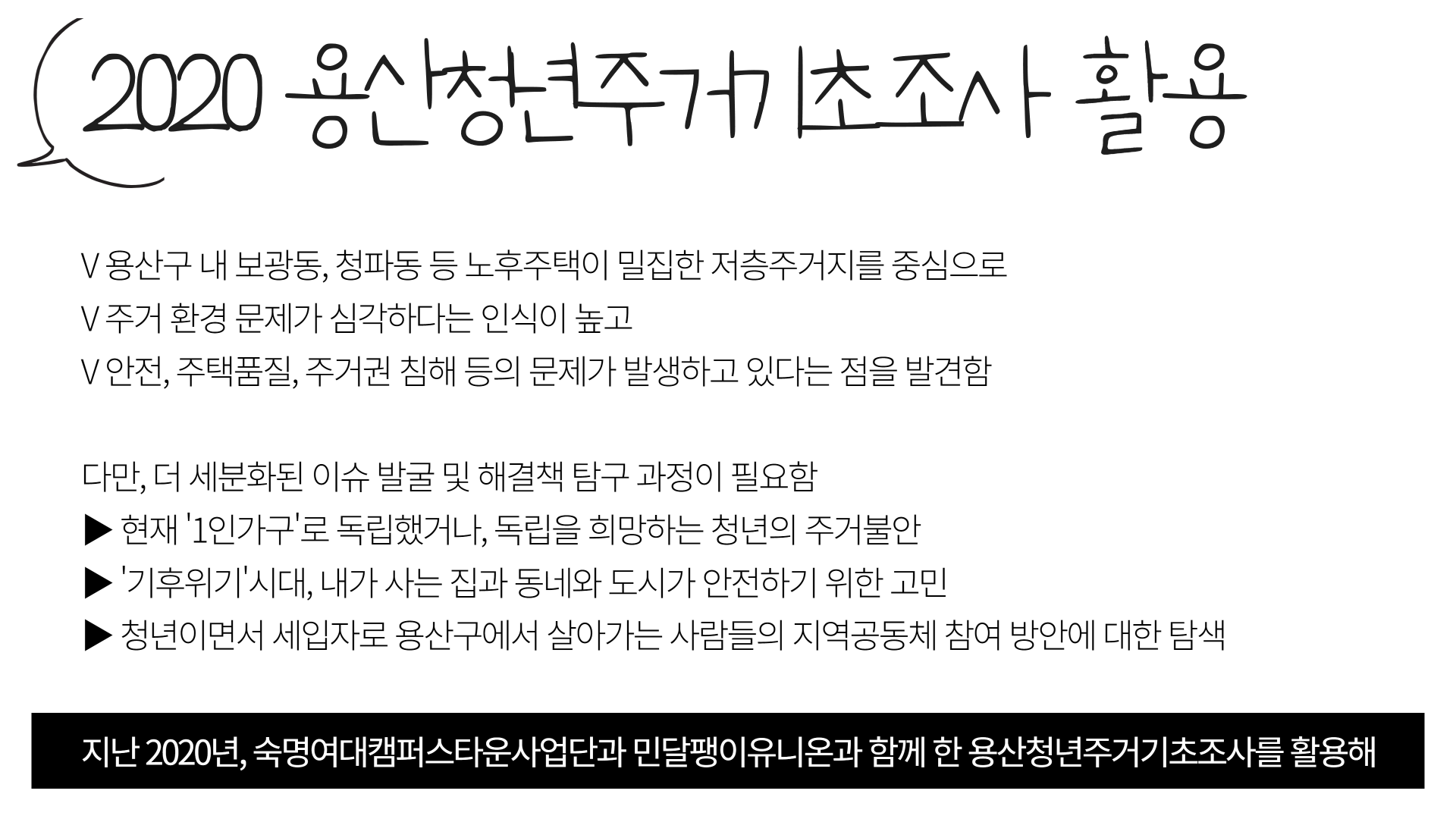 지난 2020년, 숙명여대캠퍼스타운사업단과 민달팽이유니온과 함께 한 용산청년주거기초조사를 활용해