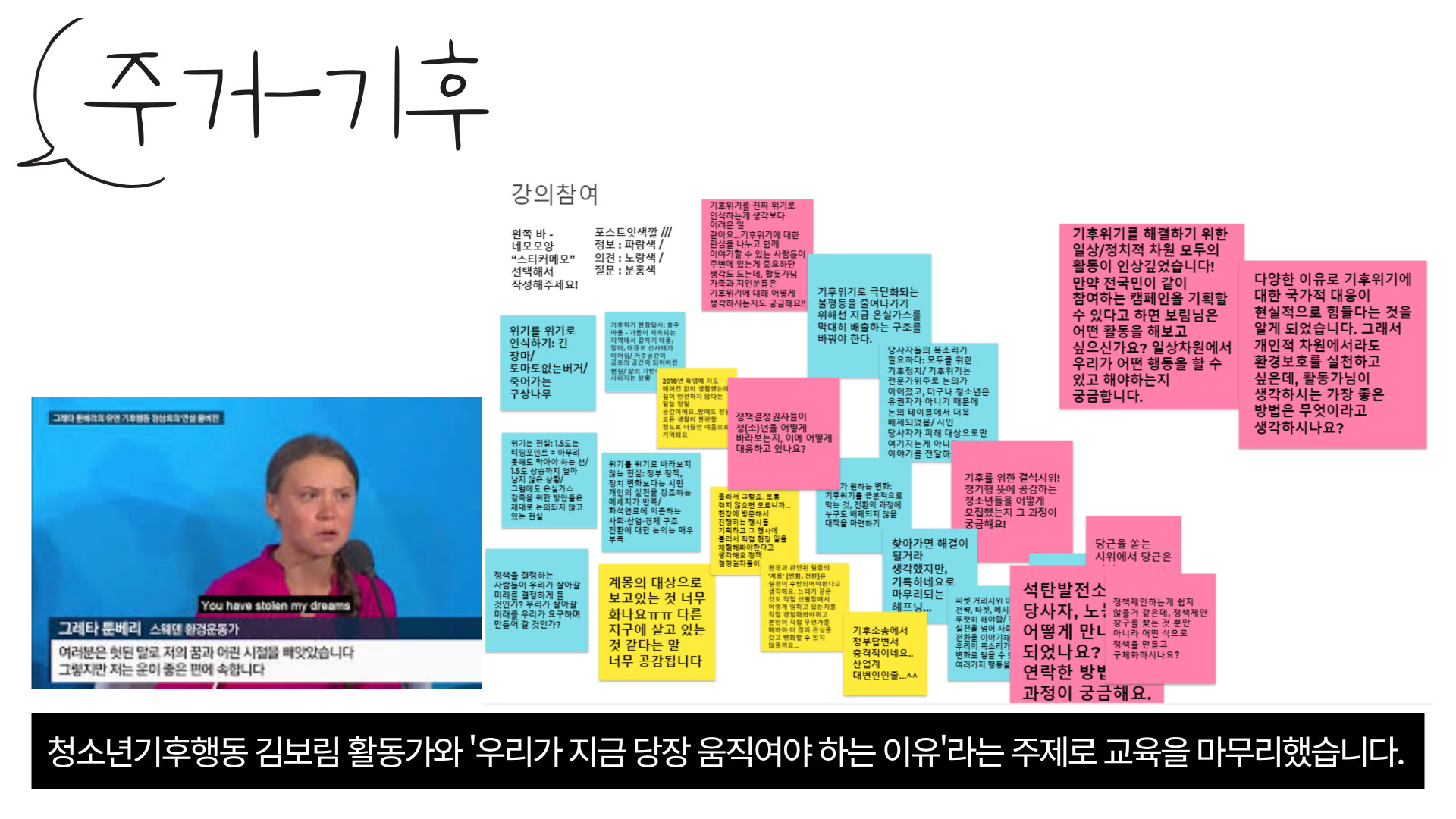마지막으로 청소년기후행동 김보림 활동가와 '우리가 지금 당장 움직여야 하는 이유'라는 주제로 교육을 마무리했습니다.