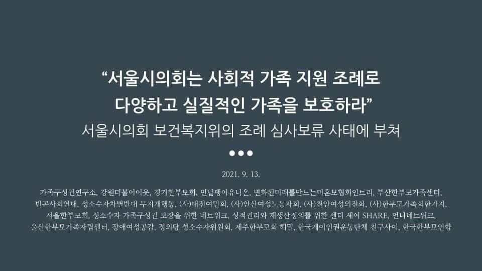 지난 9월 7일 서울시의회 보건복지위원회(위원장 이영실)는 권수정 시의원(정의당) 외 24인이 대표 발의한 ‘서울특별시 사회적 가족 지원을 위한 기본 조례안(이하 사회적 가족 지원 조례)2’을 상정과 동시에 심사보류하였다. 심사보류의 의견을 낸 의원들은 시기상조 혹은 상위법과의 충돌을 주장했다.