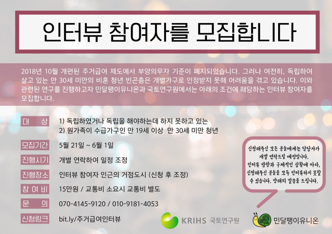 ![]() 민달팽이유니온은 지난 5월부터 국토연구원과 함께 30세 미만 주거급여 지급 방안에 대한 인터뷰를 진행하고 있습니다. 인터뷰의 목적은 생계 및 주거를 꾸리고 있음에도 '30세 미만'이라는 이유로 주거급여를 받지 못하는, 법의 사각지대 놓인 청년의 목소리를 듣는 것입니다. - 원가족이 기초생활수급 대상 - 30세 미만 두 가지에 해당하는 분들의 목소리가 절실합니다. 아래 링크를 통해 참여 부탁드립니다!