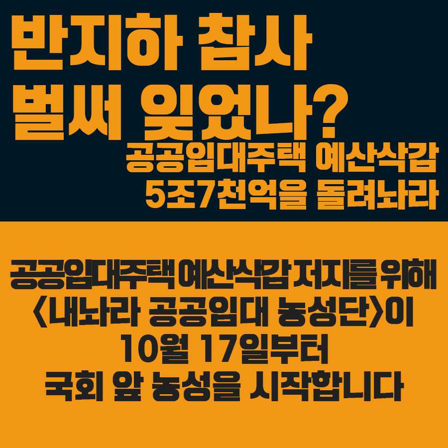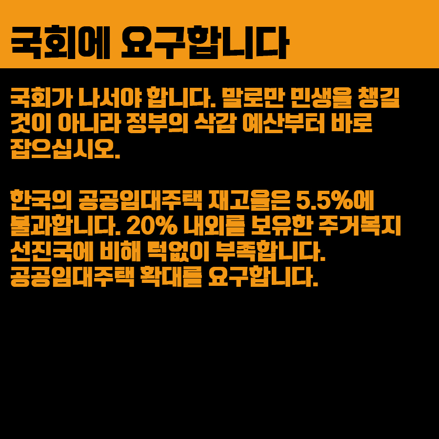 국회는 공공임대주택 예산과 주거복지 예산 대폭 확대하라! - 국회가 나서야 합니다. 말로만 민생을 챙길 것이 아니라 정부의 삭감 예산부터 바로 잡으십시오. - 한국의 공공임대주택 재고율은 5.5%에 불과합니다. 20% 내외를 보유한 주거복지 선진국에 비해 턱없이 부족합니다. 공공임대주택 확대를 요구합니다.