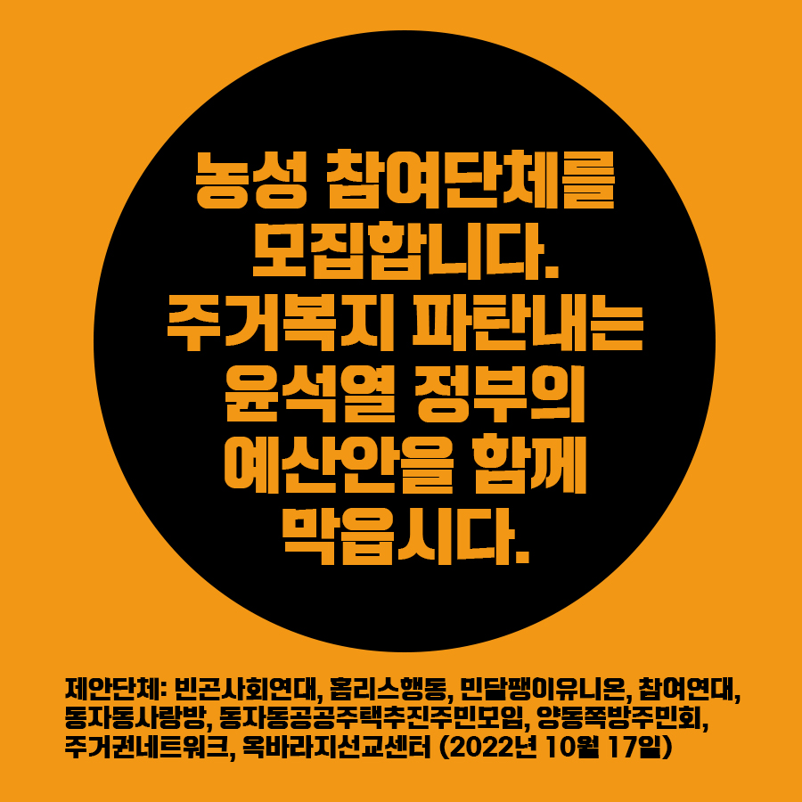 농성에 함께 해주십시오 - 주거복지 파탄내는 윤석열정부의 예산안을 함께 막읍시다. 농성 참가단체로 함께 해주시기 바랍니다. - 10월 20일 (목) 오전10시, 공공임대예산삭감 저지 각계각층 지지 기자회견 후 농성단 참가단체들의 회의를 열 예정입니다. 참가를 요청드립니다.