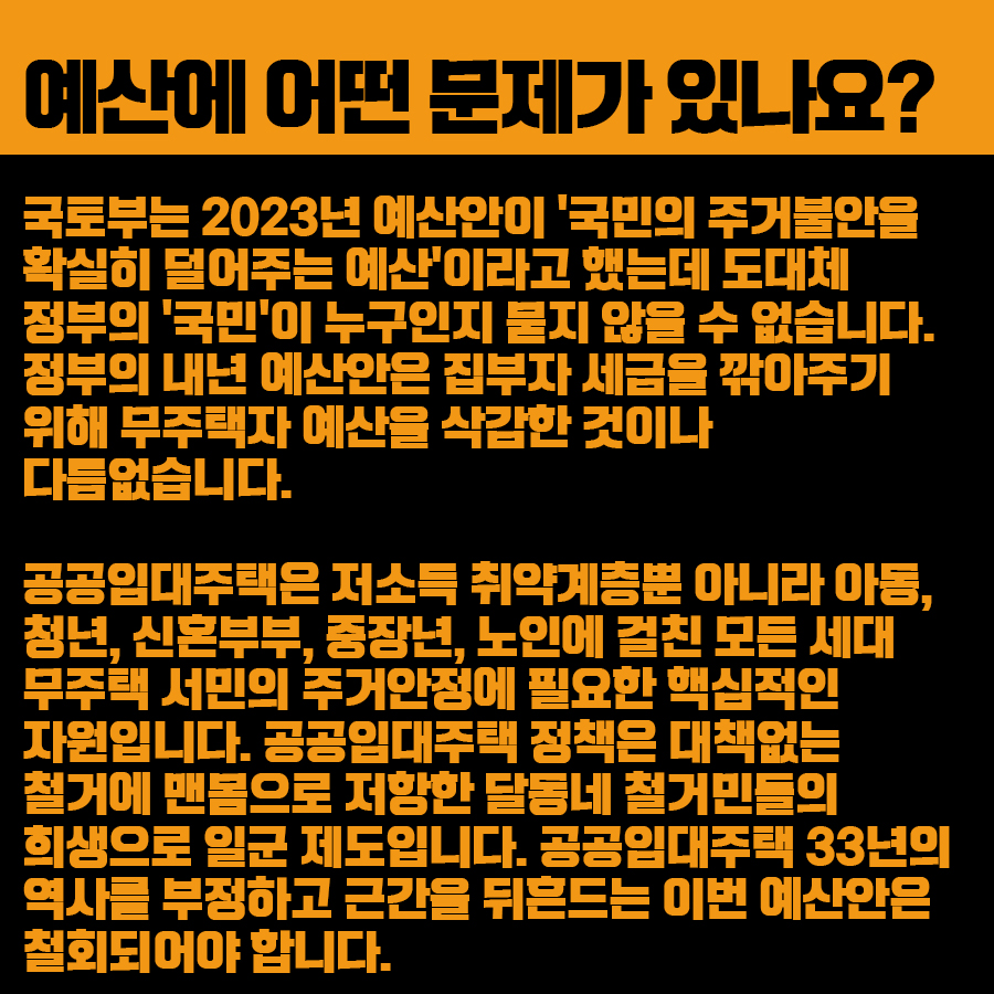 집부자 세금 깎아주고, 무주택자 지원 줄인 잔인한 예산안 - 국토부는 2023년 예산안이 '국민의 주거불안을 확실히 덜어주는 예산'이라고 했는데 도대체 정부의 '국민'이 누구인지 묻지 않을 수 없습니다. 정부의 내년 예산안은 집부자 세금을 깎아주기 위해 무주택자 예산을 삭감한 것이나 다름없습니다. - 공공임대주택은 저소득 취약계층뿐 아니라 아동, 청년, 신혼부부, 중장년, 노인에 걸친 모든 세대 무주택 서민의 주거안정에 필요한 핵심적인 자원입니다. 공공임대주택 정책은 대책없는 철거에 맨몸으로 저항한 달동네 철거민들의 희생으로 일군 제도입니다. 공공임대주택 33년의 역사를 부정하고 근간을 뒤흔드는 이번 예산안은 철회되어야 합니다.