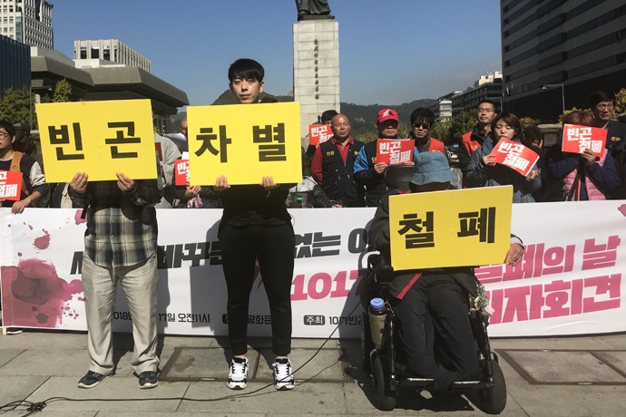 17일, 10.17 빈곤철폐의 날 조직위원회(아래 조직위)는 유엔이 정한 세계 빈곤퇴치의 날을 '빈곤철폐의 날'로 명명하고 오전 11시 광화문 광장에서 빈곤과 불평등이 없는 세상을 외치며 기자회견을 진행했습니다. 이들은 “빈곤문제는 한시적인 구호나 원조로 해결할 수 없다. 가난한 사람들의 몫을 빼앗는 자본과 이들에게 가해지는 폭력을 엄호하는 사회구조에 맞서 함께 목소리를 내자”고 외쳤습니다 .조직위는 빈곤을 해결하기 위한 대책으로 △집, 거리, 가게에서 쫓겨나지 않는 세상 △부양의무자 기준, 장애등급제, 장애인 수용시설 완전폐지 △노점상 강제철거·노점관리대책 중단 △용역 관련 예산 전면삭감 △선대책 후철거 등 순환식 개발 시행 △홈리스에 대한 분리와 배제 중단 △가난한 이들의 건강보험 체납 해결 △사회서비스와 공공인프라 강화 △과로사, 초과노동, 임금격차 해결 △공공주택 확충 △전·월세 상한제 도입 △포괄적 차별금지법 제정 △복지 사각지대를 방치하는 복지제도 개선 등을 요구했는데요.