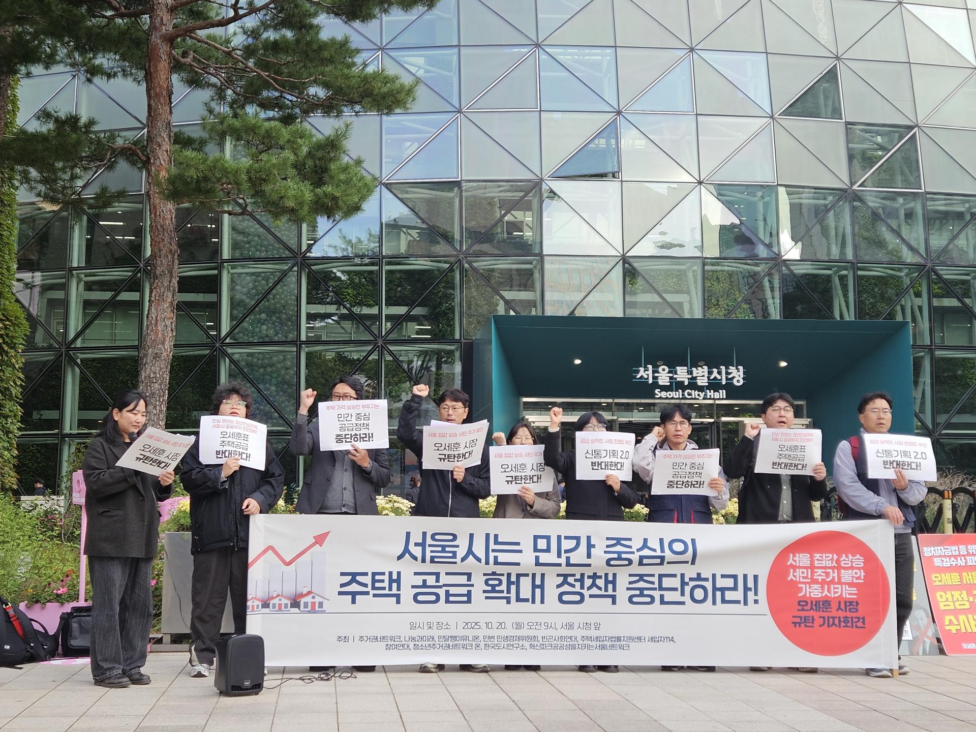 10월 20일 월요일 오전 9시, 주거권네트워크 등은 서울 시청 앞에서 서울시의 민간 중심 주택 공급 정책 중단을 요구하고 오세훈 시장을 규탄하는 기자회견을 열었습니다. 오세훈 시장은 ‘신통기획 2.0”, ‘등록민간임대주택 활성화 방안’, ‘청년안심주택 피해에 대한 대책’ 등을 연이어 발표했지만 이는 세입자의 권리, 주거 안정화보다는 민간개발 활성화를 위한 무분별한 규제 완화가 끝이었습니다. 이를 규탄하고 제대로 된 정책을 요구하며, 민간 중심의 주택 공급 확대 정책을 중단할 것을 촉구하고 왔습니다.